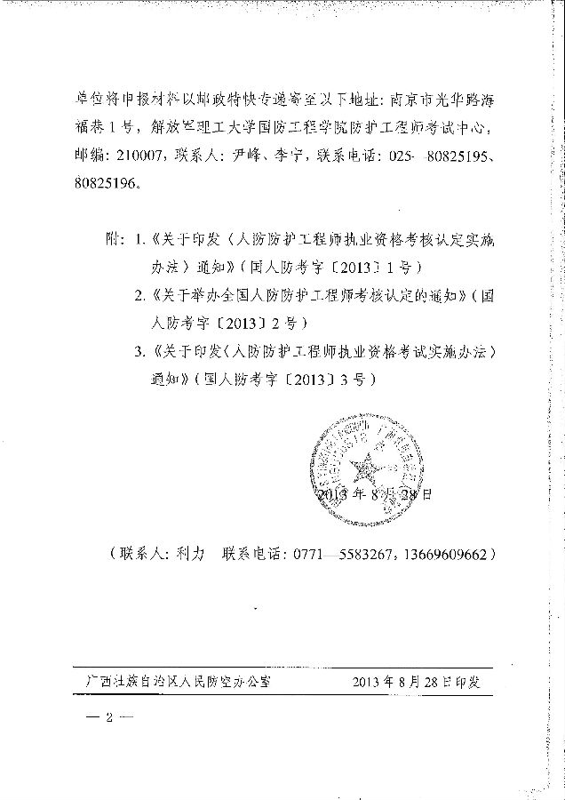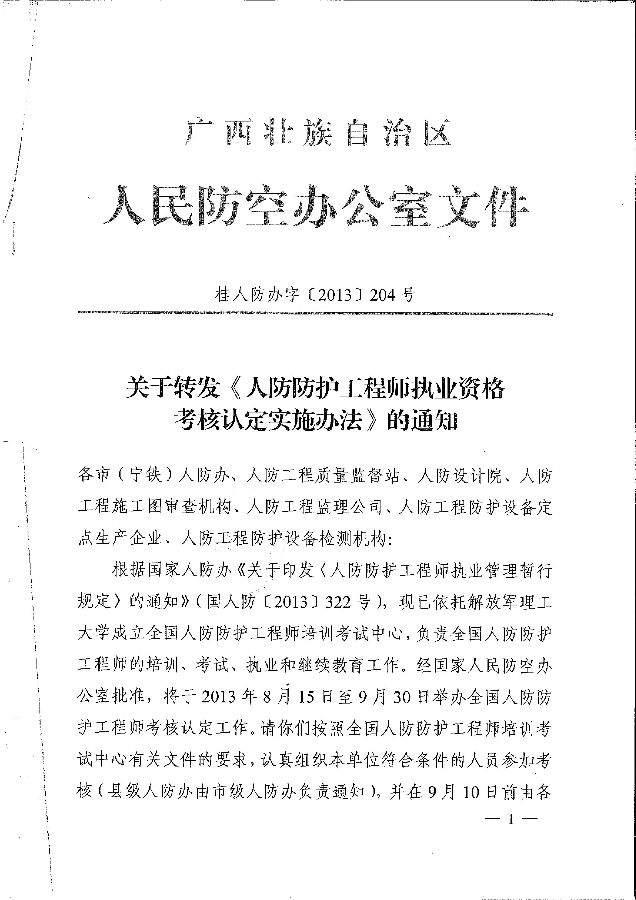 桂人防辦字【2013】204號關于轉發(fā)《人防防護工程師執(zhí)業(yè)資格考核認定實施辦法》的通知
