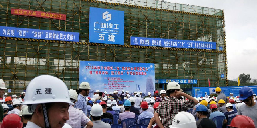 2018年5月11日,公司技術管理部門有關負責人和南寧市內各項目總監(jiān),參加了由南寧市城鄉(xiāng)建設委員會、南寧市安全生產管理監(jiān)督局等單位主辦的2018年南寧市建筑工程“質量安全管理標準化”暨“黑臭水體、施工揚塵”專項治理觀摩會。觀摩項目是廣西建工五建總承包施工的“廣西醫(yī)科大學東盟國際口腔醫(yī)學院項目北地塊主體工程”項目。觀摩會引千人觀摩,持續(xù)2小時。觀摩主要內容如下: